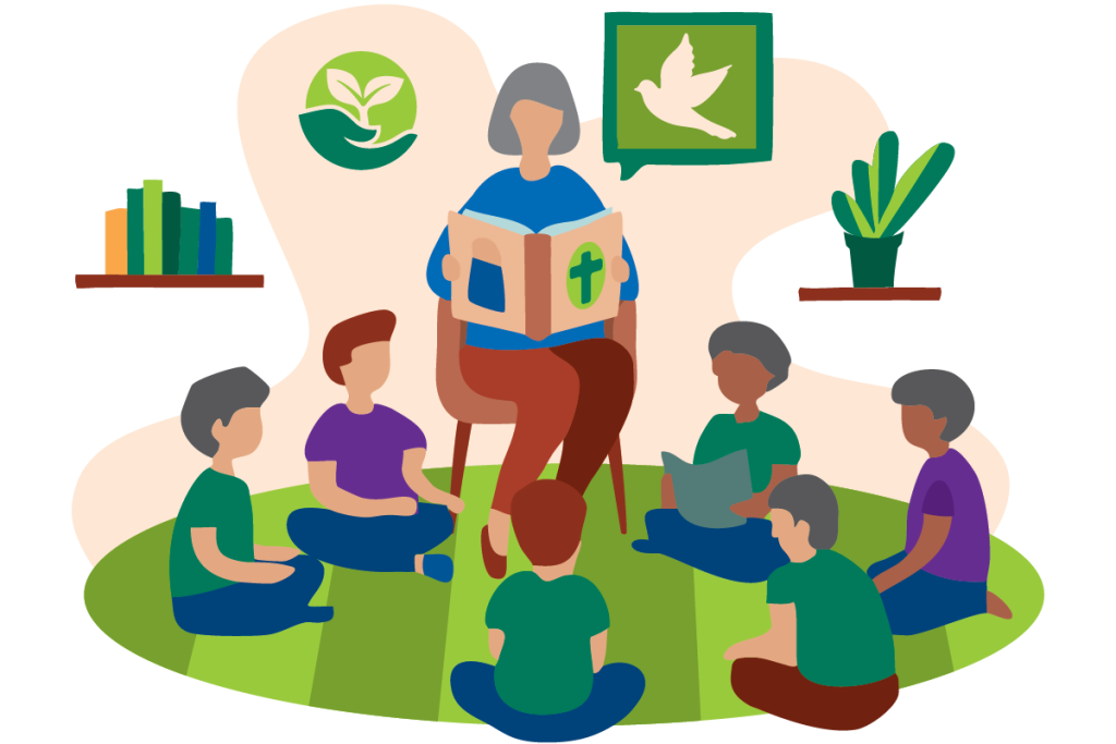 Os grupos de evangelização infantil atendem crianças de 2 a 13 anos, divididas por faixa etária: de 2 a 6 anos e de 7 a 13 anos.